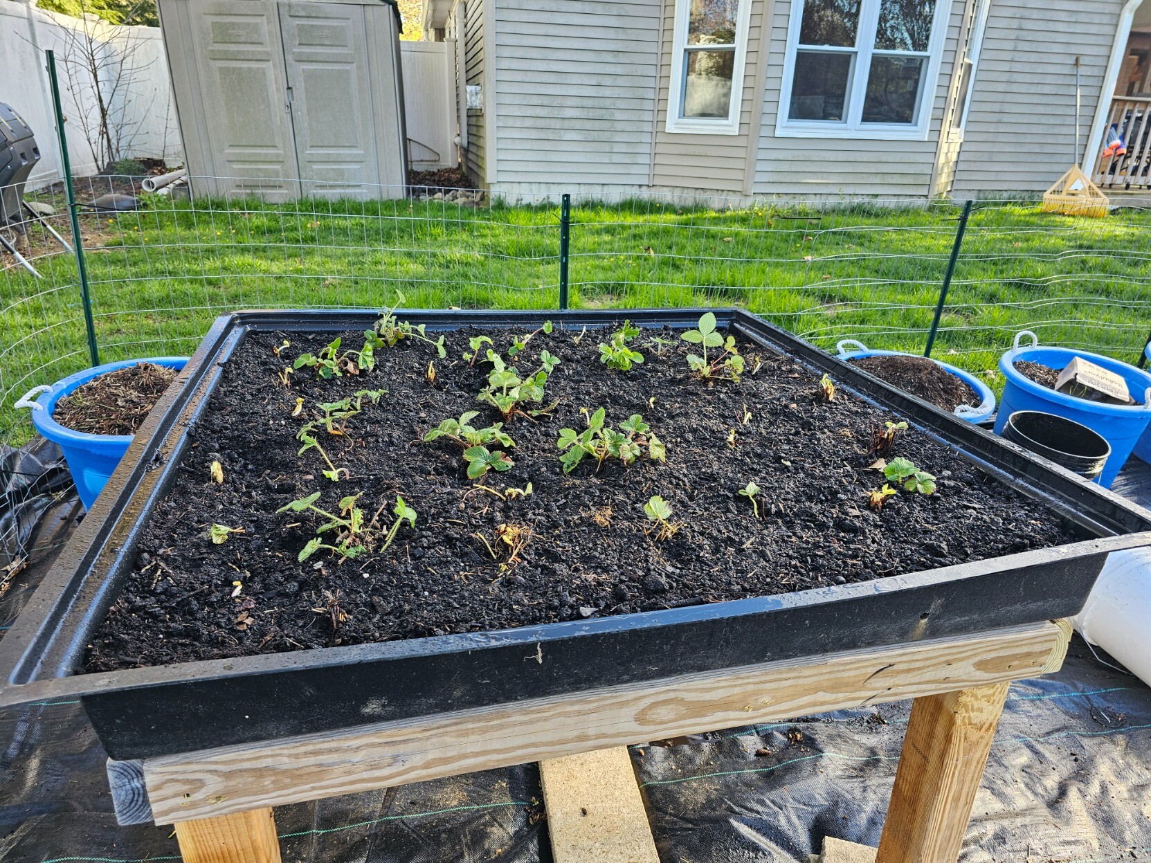Strawberries are planted! It took all three of us to level the bed, fill it (with dirt from another bed that needs to be refreshed), and some existing and a lot of new plants (bare root) planted.