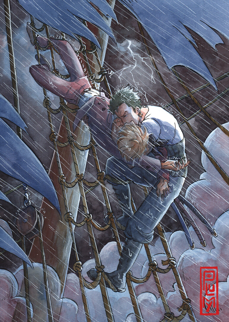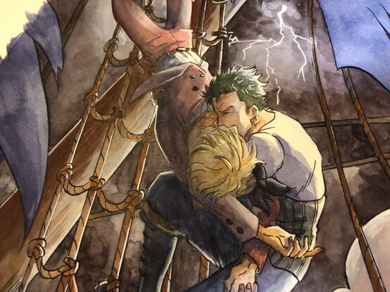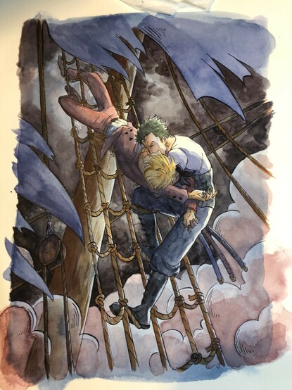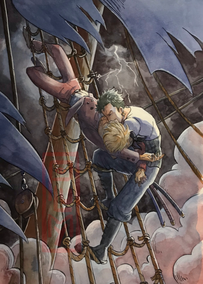 And we are done ! Kiss of life - Pirates edition ! :blobcatcoffee: Thank you all for your enthusiasm while I was sharing my process :tialove: #OnePiece #Zosan #Fanart #TraditionalArt #CreativeToots #MastoArt