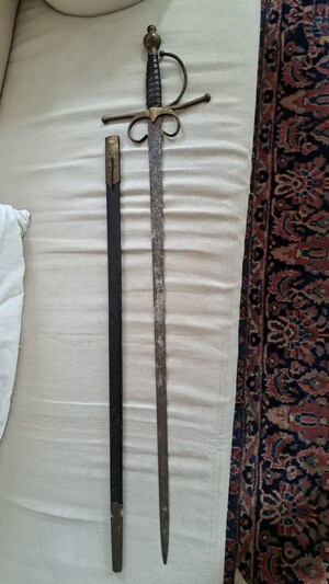 #geschiedenis #dtv #twitterstorians Mijn zoontje heeft een spreekbeurt over zwaarden. Hij mag deze lenen als showmodel. Is gevonden onder een 17e eeuws pand. Wat voor zwaard is dit? #rt wordt gewaardeerd.
