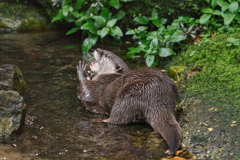 Kaum zu glauben, daß der große und kräftige Tuan🦧 vor einem guten halben Dutzend #Zwergotter Reißaus nimmt. 🤣🧜♀️ Aber 7 Otter (einer fehlt auf dem Bild) haben halt eine Menge Zähne sowie 28 Pfoten mit 140 Krallen...